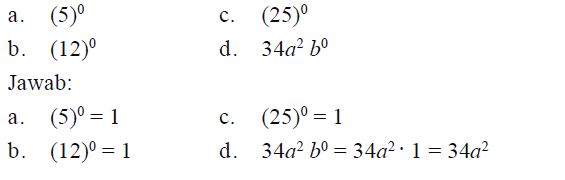 Supaya lebih jelas coba kerjakan contoh soal bilangan berpangkat nol di bawah ini. Bilangan eksponen nol 0 apabila a 0 maka a 1 atau a tidak boleh sama dengan 0. Karena sekarang sudah banyak sekali artikel yang akan menjelaskan tata cara dan contoh contoh soal yang sangat mudah di mengerti. Sebelumnya kita telah mengetahui bahwa sifat sifat bilangan berpangkat yaitu.