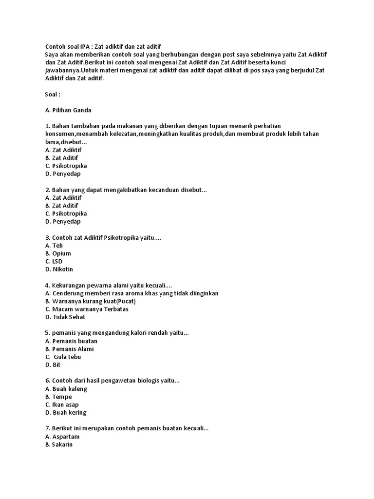 Contoh soal essay zat aditif. Diantara zat zat di bawah ini yang bukan merupakan zat. Soal pilihan ganda materi zat aditif pewarna pemanis pengawet penyedap. Contoh soal zat aditif pada makanan lengkap dengan jawabannya ini berbentuk pilihan ganda dengan jumlah 20 butir soal. Zat aditif sering ditambahkan pada makanan untuk berbagai tujuan soal dan jawaban berikut akan akan menjelaskan kenapa hal itu di lakukan.