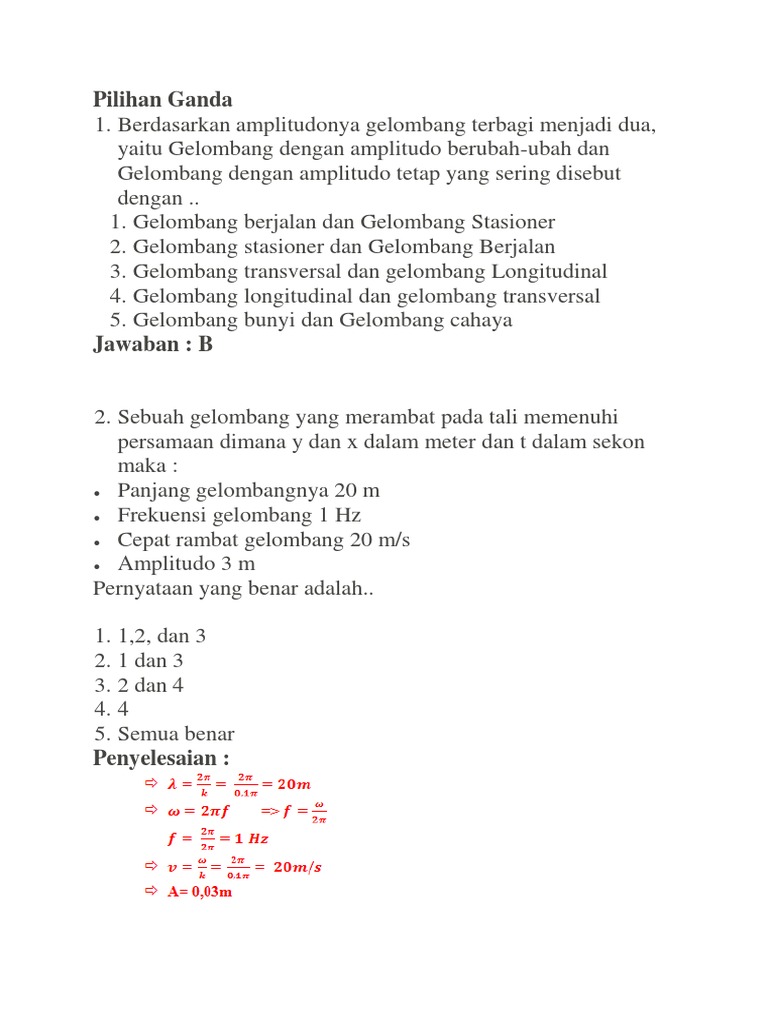 Contoh soal gelombang stasioner pilihan ganda. Contoh soal gelombang berjalan beserta pembahasannya. October 23 2018 admin leave a comment. Dua balok kayu kecil a dan b terapung di permukaan danau. Pilihan ganda berdasarkan amplitudonya gelombang terbagi menjadi dua yaitu gelombang dengan amplitudo berubah ubah dan gelombang dengan amplitudo tetap yang sering disebut dengan.