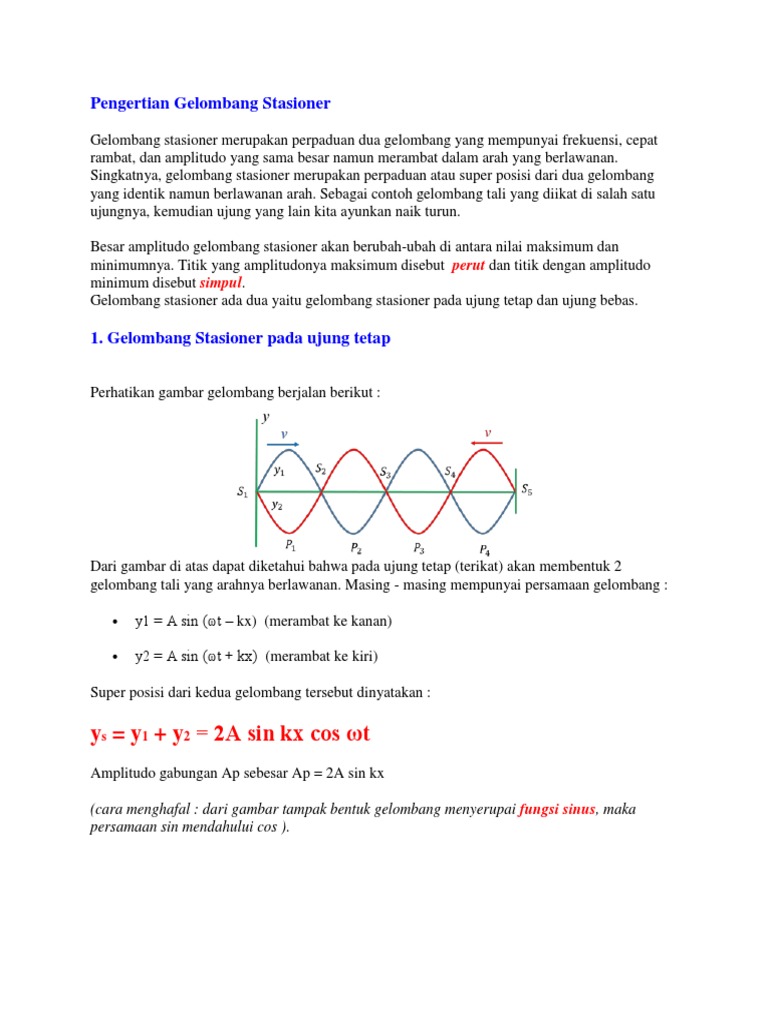 Dengan demikian persamaan gelombang stasioner ujung tetap dapat dinyatakan dengan formulasi rumus berikut. Y 2a sin ωt cos kx. Untuk gelombang stasioner yang terjadi pada tali dengan ujung tetap maka gelombang pantul akan mengalami pembalikan fase gelombang sebesar periode gelombang atau sebesar π. Agar dapat mengetahui simpangan dari gelombang stasioner maka gelombang stasioner dapat dikelompokan menjadi dua yaitu gelombang stasioner ujung tetap dan bebas.