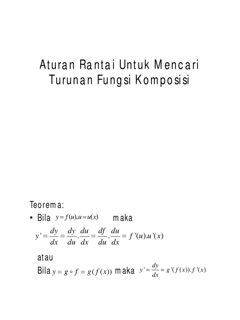Komposisi fungsi yang biasanya diturunkan dengan aturan rantai adalah bentuk pangkat dari fungsi aljabar yang. Penjelasan aturan rantai turunan fungsi misalkan ada fungsi y f g x kita akan menentukan turunannya dengan aturan rantai. Hal ini disebabkan hampir kebanyakan persamaan dalam penerapan kalkulus fisika mengandung fungsi didalam fungsinya. Aturan ini membantu menyelesaikan turunan fungsi yang terdiri dari komposisi dua fungsi atau lebih.