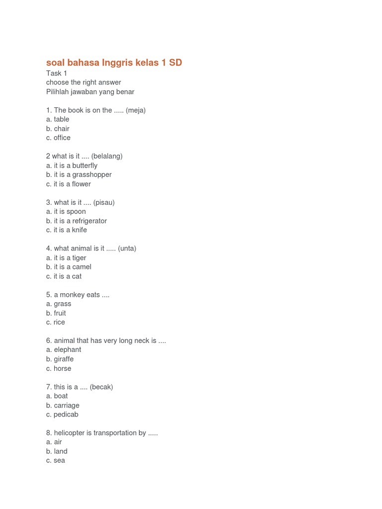 Soal bahasa inggris kelas 5 mid semester genap tahun pelajaran 2012 2013 latihan soal ulangan umum bahasa inggris sd kelas 1 tahun pelajaran 2012 2013 docx download now. Contoh soal bahasa inggris kelas 1 sd berserta kunci jawaban. Sama seperti dalam bahasa indonesia dalam bahasa inggris ada dua jenis binatang animal yaitu binatang jinak tame animals dan binatang liar wild animals. Mari kita simak contoh soalnya berikut ini.