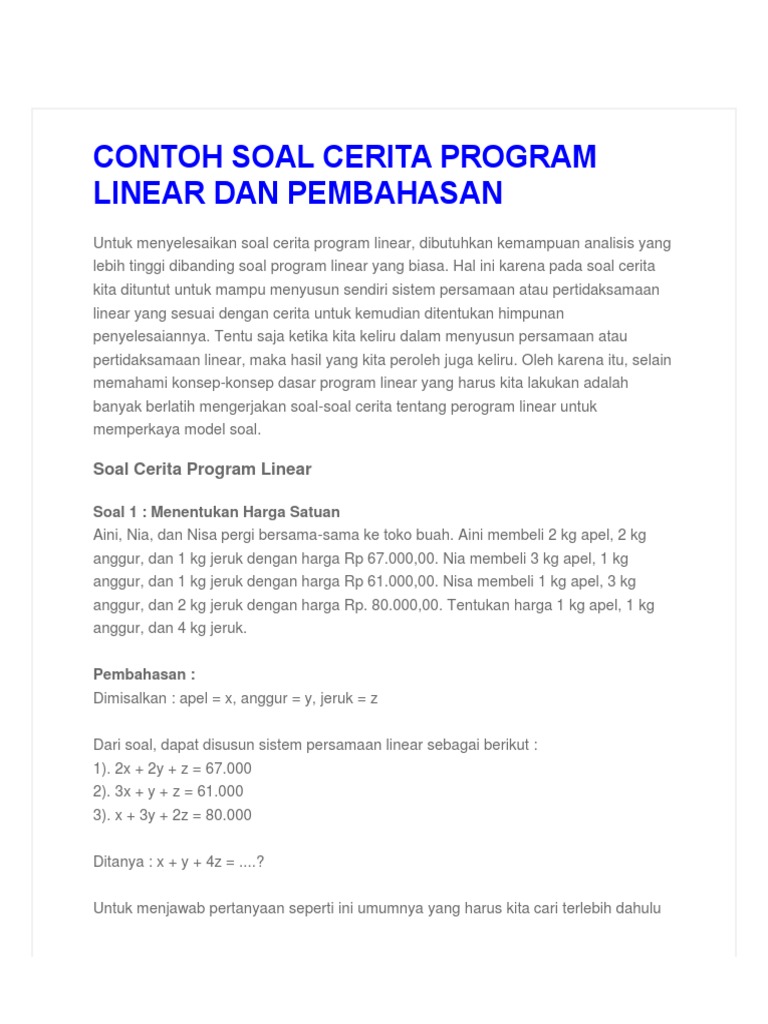 Contoh soal cerita program linear dalam kehidupan sehari hari dalam materi pelajaran di sekolah hal ini sering disebut sebagai menyelesaikan masalah masalah nyata soal cerita yang berkaitan dengan spldv. Sebelum masuk ke contoh soal program linear dan pembahasan program linear matematika sma mari kita bahas dasar materi mengenai program linear matematika sma dan pembahasannya terlebih dahulu. Hal yang akan dipelajari diantaranya program linear maksimum dan minimum contoh soal program linear metode grafik serta contoh soal program linear dalam kehidupan sehari hari. Selain itu ada soal yang membahas mengenai kasus kusus dalam permasalahan program linear seperti titik pojok.