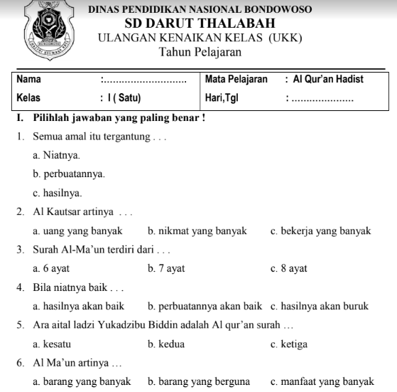 Soal ukk alquran hadits mts kelas 7 dan kunci jawabannya tahun 2018 merupakan contoh soal terbaru khusus untuk bapak ibu yang mengampu mapel quran hadits kelas 7 vii madrasah tsanawiyah mts yang akan mengahadapi ujian kenaikan kelas ukk atau penilaian akhir tahun pat untuk ta 2017 2018 untuk kurikulum 2013 maupun ktsp yang akan dilaksanakan di semester 2.
