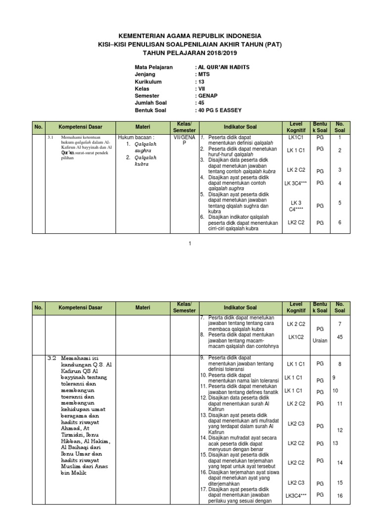 Soal pat quran hadits kelas 7. Dengan soal ini diharapkan dapat membantu sebagai media drill dan latihan. Download naskah soal klik. Materi yang akan dibagikan ini merupakan materi penting dan wajib untuk dipelajari bagi peserta didik yang duduk di bangku mts yaitu al qur an hadits. Banyak di cari soal2 alqurwan hadits kls 7 semester genap dan kunci jawabannya soal pat mts quran hadits 8 semester 2 https pendidikangratis id soal ukk quran hadits kelas vii mts terbaru soal qurdis pat kls 7 soal alquran hadits kelas 7 semester 2 dan kunci jawaban alquran dan al hadis kelas 7 download soal quran hadis kelas vii dwonload soal pat qnh kls 7 kumpulan soal alquran.