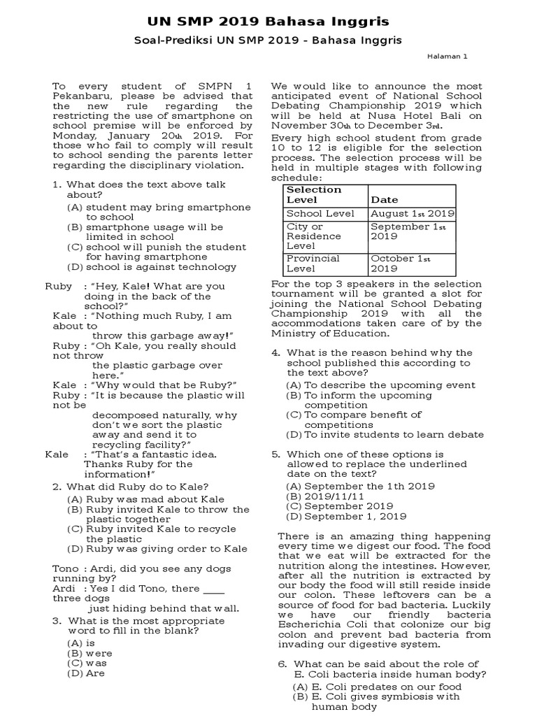 Bagi adik adik sahabat sbi yang ingin latihan soal ujian bahasa inggris. Bukan hanya pada proses pelaksanaannya namun juga dari sisi hakikat maksud dan tujuan kebijakannya selalu memberikan wacana yang menarik berbagai pihak baik yang mendukung maupun yang. Berikut ini adalah file tentang soal un english smp 2019 yang bisa bapak ibu unduh secara gratis dengan menekan tombol download pada tautan link di bawah ini. Soal un english smp.