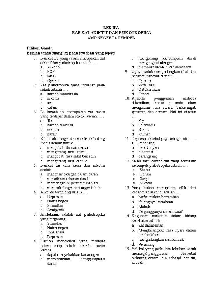 Contoh soal zat adiktif smp. Berikut dibagikan latihan soal ipa zat adiktif dan psikotropika kelas 8 smp k13. Pembahasan ipa smp un 2018 no 6 10 jawablah soal berikut dengan benar. Oleh gurusd diposting pada 17 oktober 2017 10 februari 2019 smp contoh soal lomba mapsi interval nada kelas 6 sd soal pg menulis surat lamaran pekerjaan kls xi sma soal teknologi dan informasi smp soal dan jawaban struktur pasar mata download rpp kkm panduan rpp program tahunan.
